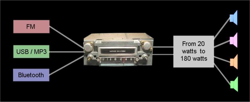 | 45 Watts Per Speaker For Up to 4 Speakers Whereas virtually all classic car audio systems deliver 5 to 10 watts per channel (and this is divided between 2 speakers in 4-speaker systems), the FMR-1 module puts out an ear-stomping 45 watts PER SPEAKER with incredible frequency range and with very low distortion. If you plan to use only 1 or 2 speakers to keep your car all-original, you can simply leave the unused speaker output wires disconnected. Your Radio Operates Exactly the Same as it Did Before Your volume, tone, balance, fader and band switch (if so equipped) will work as they did before - EXCEPT that now you can temporarily use one control to substitute for a control that was not there before! For instance, your Delco unit now has a left-right balance control, or your Ford or Chrysler unit now has a front-rear fader. By simply giving your tone control a couple quick turns, your tone control becomes a front-rear fader (for example) until the FMR-1 senses that you have stopped adjusting it and returns the unit to normal operation! Incredible Clarity of Sound! It's no secret that all vintage car radios sound like "loud transistor radios" - tinny, scratchy and muffled especially at high volume levels. In addition, the tone control might as well not even be there as it must always be fully clockwise due to the overabundance of midrange (vocal and guitar frequencies) which tends to obscure subtle sounds such as the drummer's hi-hat, cymbals and high-end overtones. In short, your original factory radio has no finesse. And when playing low fidelity 8 track tapes, this lack of finesse is even more pronounced. But with the FMR conversion, the frequency response is equal at all frequencies with the tone control in the centered position. This means that you will hear sounds you didn't hear before at above-center position - the very "live" acoustical environment of Motown recordings, the shimmering plate reverb often used on vocals, and even the warm, clean sound of the tube guitar amplifiers used back then. Finally, for possibly the first time in your life you will enjoy near-CD quality sound from 8 track tapes. The bass is tight and punchy - not overbearing and muddy - and the FMR offers so much treble boost in the range above the highest note that can be played, you will likely find yourself turning the tone control down at times to reduce the level of these sweet-sounding harmonics and overtones. Automatic Loudness Contouring The human ear is a very Imperfect device, in that it lacks the ability to hear the extreme lows and extreme highs at low listening levels. To compensate for this, you might remember a "Loudness" switch on vintage home stereo receivers. This switch emphasizes the extreme low and high end, allowing the receiver to sound rich and full at low volume levels. But when you turn up the volume, the Loudness switch had to be turned off - or the bass would be much too strong resulting in horrible distortion and possibly damaging your speakers. But with the FMR conversion, loudness contouring is automatically applied at lower levels, and automatically reduced as the listening volume is increased. At very high volume levels, the contouring is completely removed. The end result is that your radio and 8 track player sounds rich and full at all volume levels, but without the annoying overpresence of bass when turning the volume up very high. As a former professional musician with 5 awards from Billboard and a self-produced CD on the market - and as a current professional audio technician who knows what music should sound like - I can say with confidence that you won't bee-LEEEVE how good it sounds! |