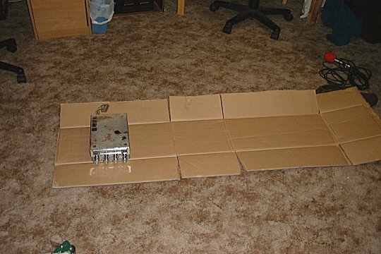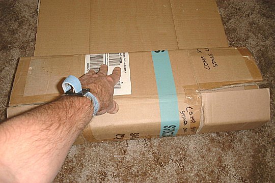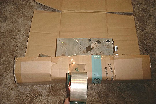 | Begin rolling the cardboard around the unit. After the roll is started, tape the cardboard to the unit as shown. Use plenty of tape and tape the cardboard to the unit in at least 3 places. This is to prevent the unit from sliding within its protective cardboard sleeve. |